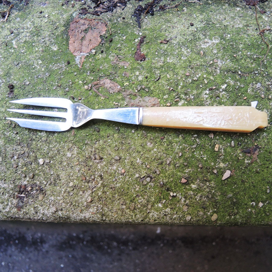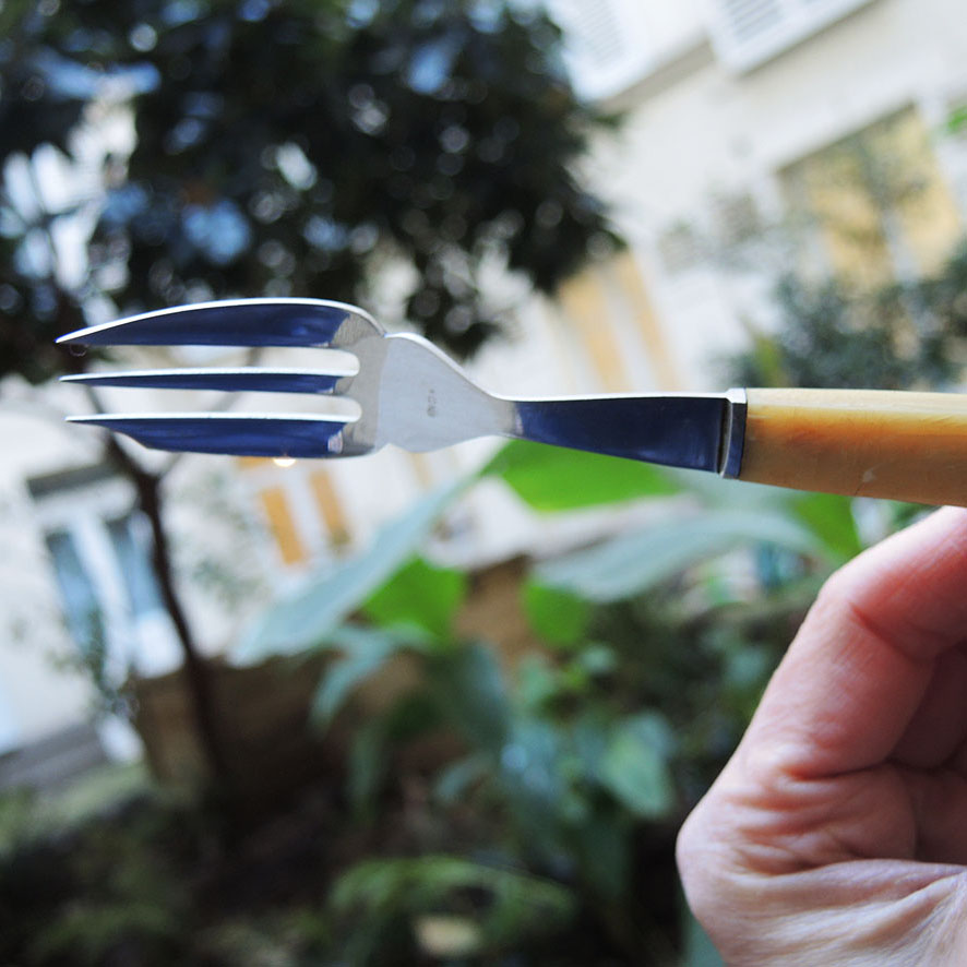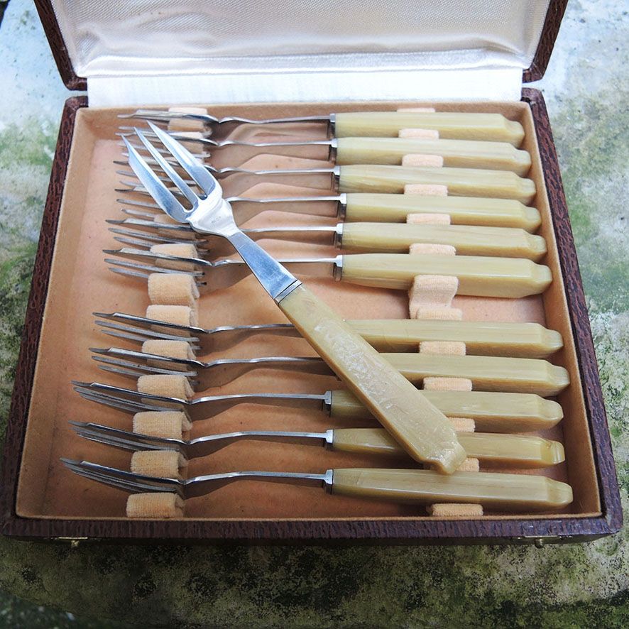 Les manches en bakélite offrent une bonne prise en main et soulignent le caractère ancien de ces pièces, tandis que les fourches en inox assurent solidité et durabilité.