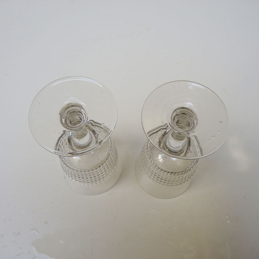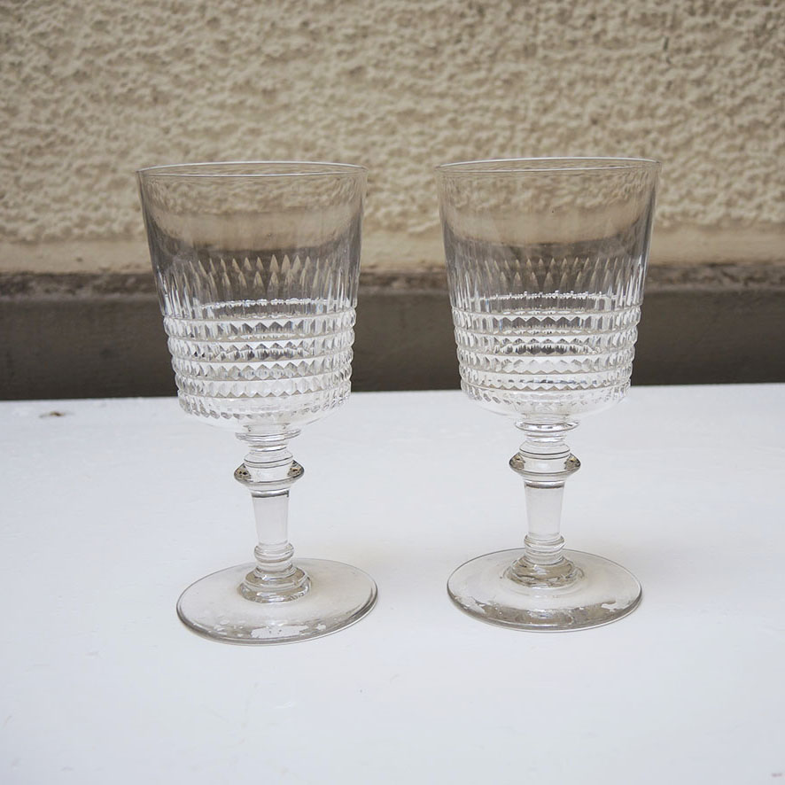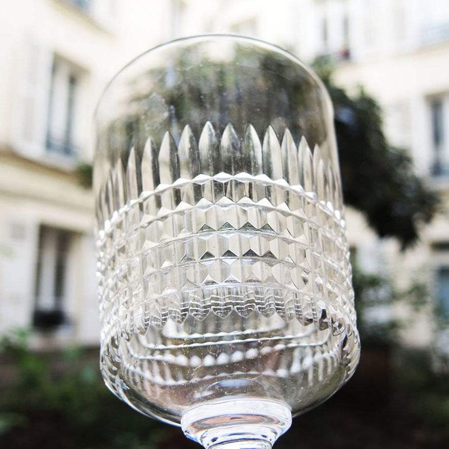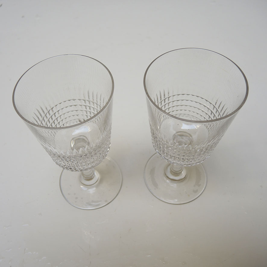 Superbe paire de verres à pied vintage en cristal taillé ornés d’un motif pointe de diamant qui rappelle le modèle Nancy de Baccarat.