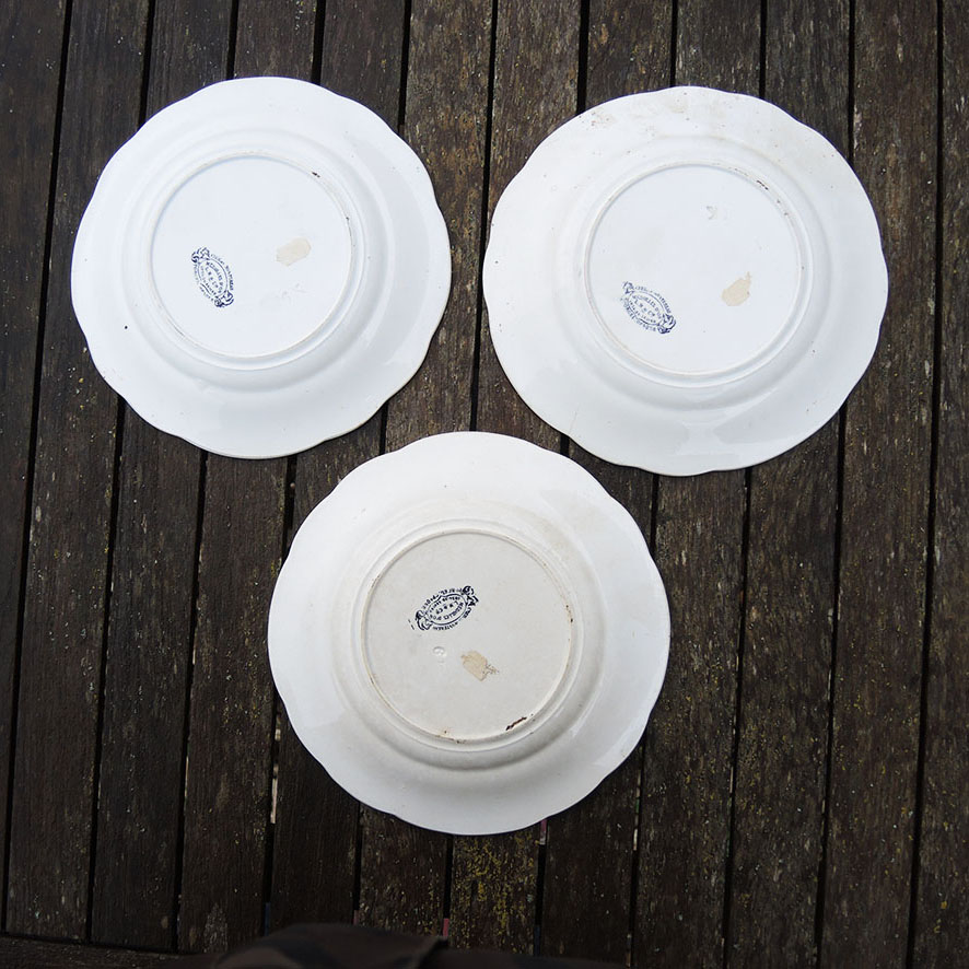 Lot de 3 assiettes parlantes vintage en impression noir et vert sur fond blanc, de la célèbre faïencerie de Creil-Montereau dont l’activité remonte à 1797 :