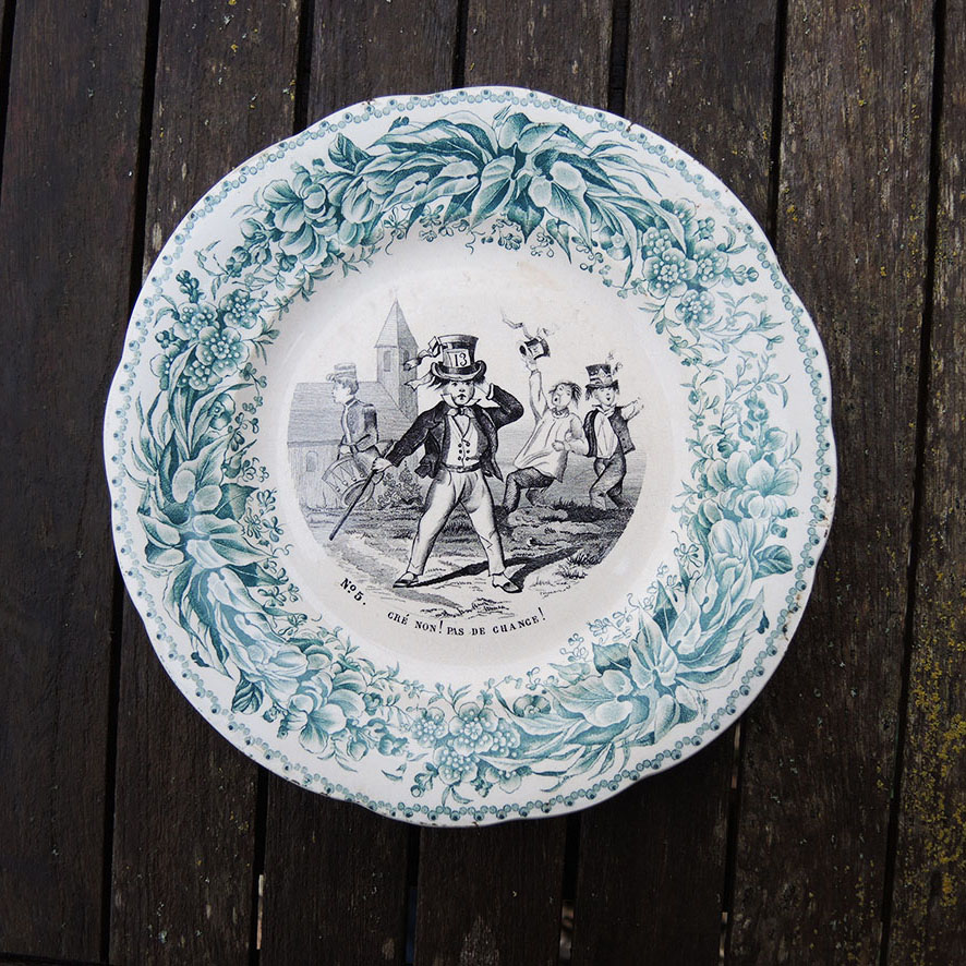 L’assiette parlante n’est pas une invention du 19e siècle, mais elle connaît un développement sans précédent en France à cette époque, grâce au procédé d’impression sérielle du décor : à partir d’un seul original gravé, on peut désormais reproduire un décor en de multiples exemplaires sans faire appel aux peintres.