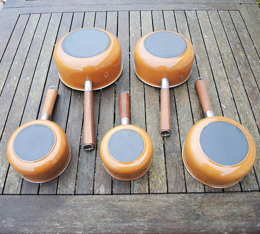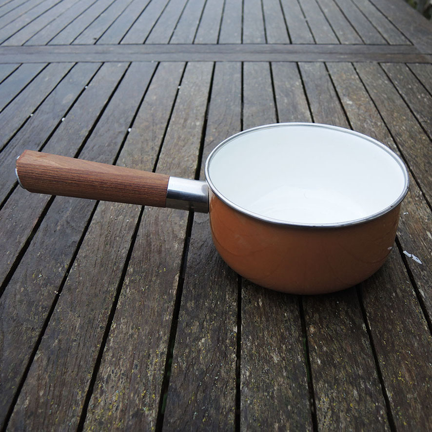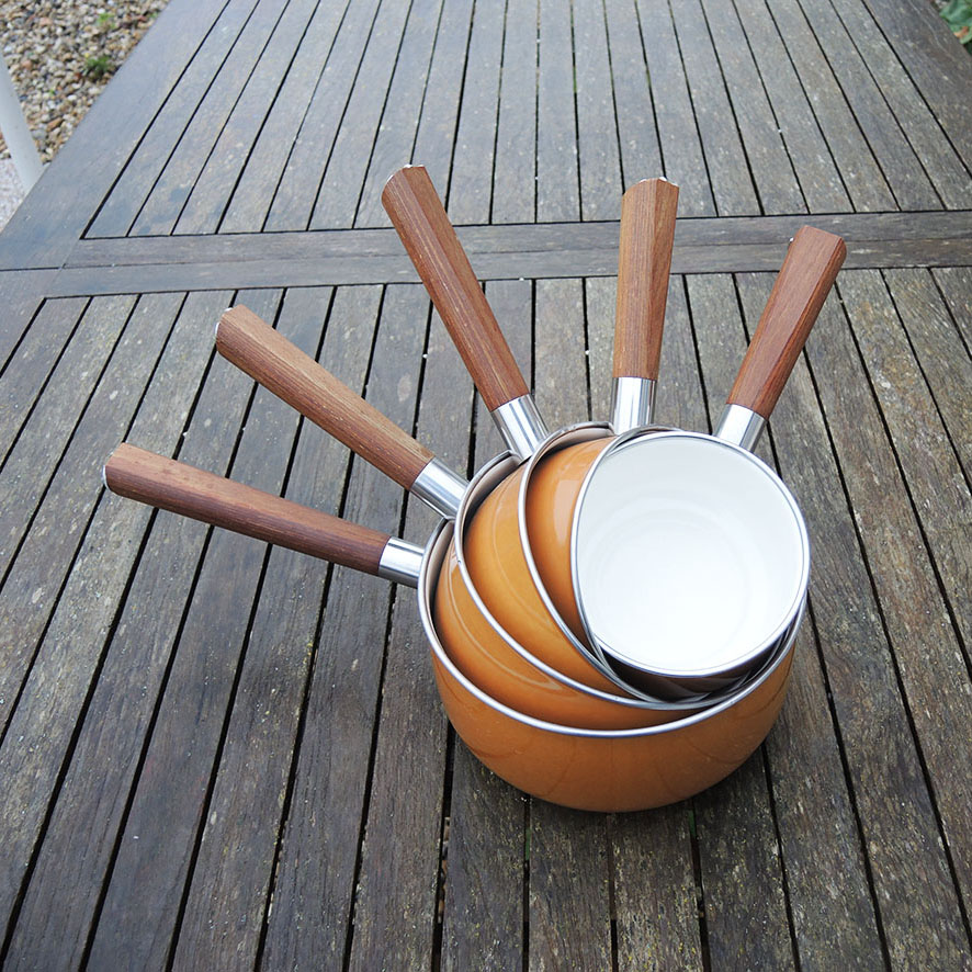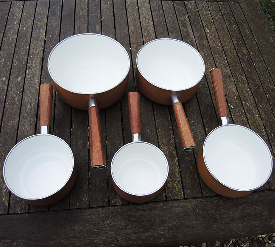 Apportez une touche d’authenticité et de charme rétro à votre cuisine avec cet ensemble de 5 casseroles vintage en tôle émaillée beige dotées d’un manche en bois.