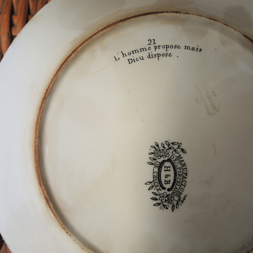 L’assiette parlante n’est pas une invention du 19e siècle, mais elle connaît un développement sans précédent en France à cette époque, grâce au procédé d’impression sérielle du décor : à partir d’un seul original gravé, on peut désormais reproduire un décor en de multiples exemplaires sans faire appel aux peintres.