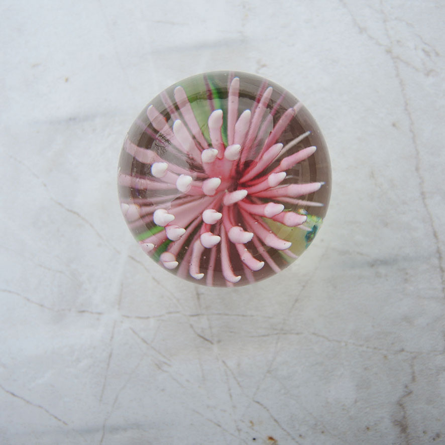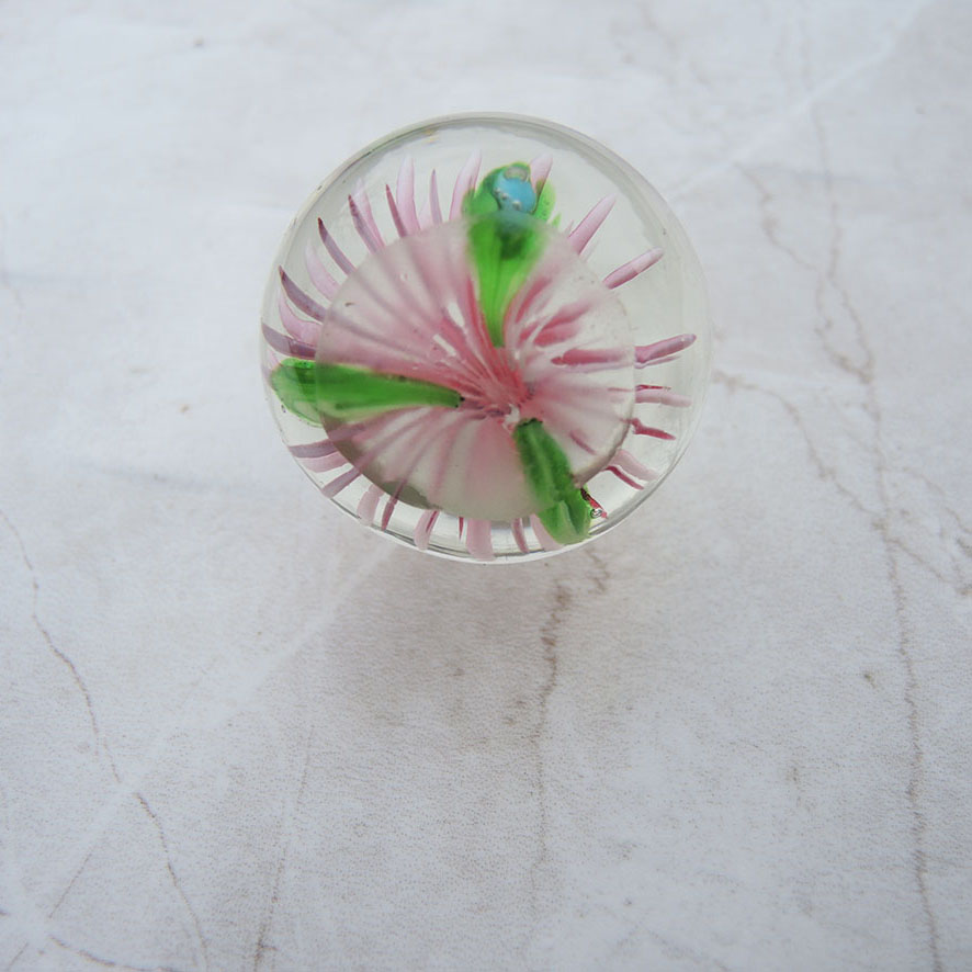 Charmant sulfure vintage, réalisé en verre épais et transparent, mettant en valeur une inclusion florale aux tons roses finement travaillée.