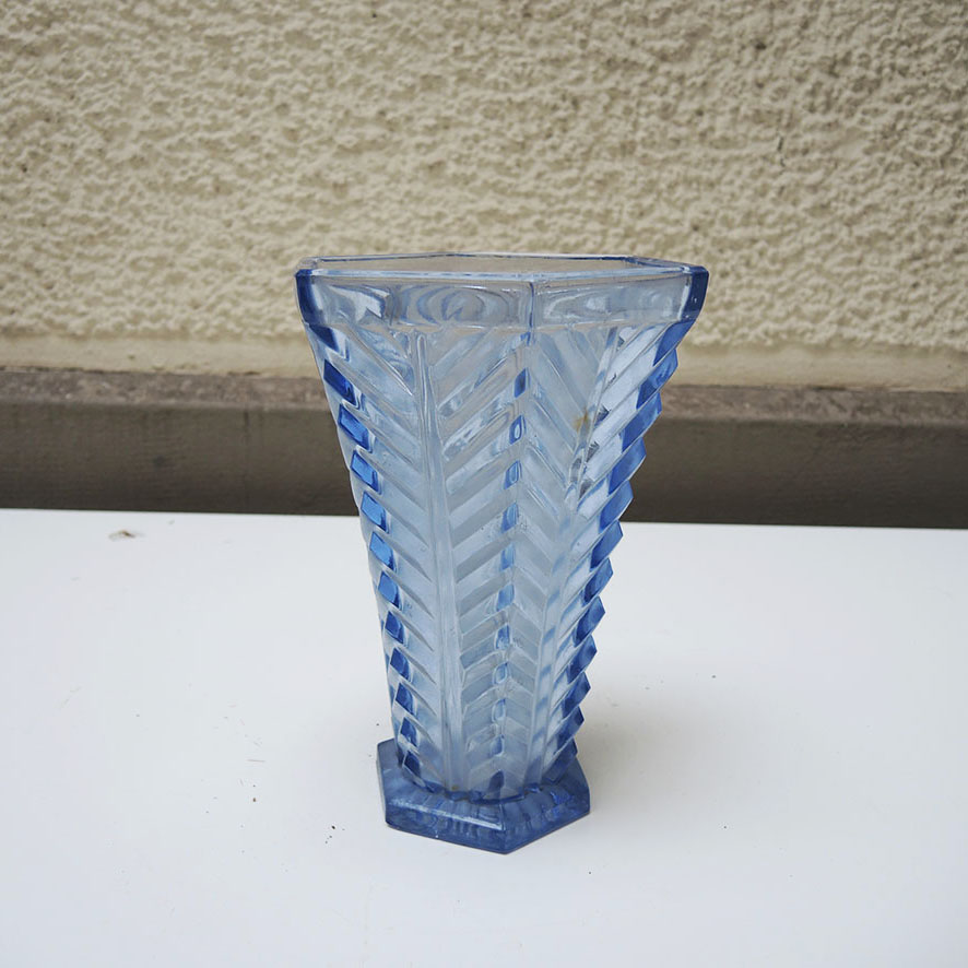 Ce petit vase vintage de forme évasé en verre moulé / pressé bleu incarne toute l’élégance du style Art Déco.