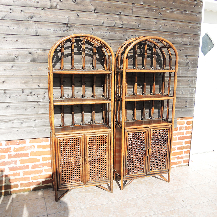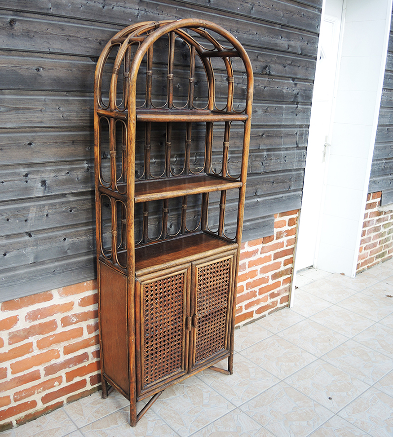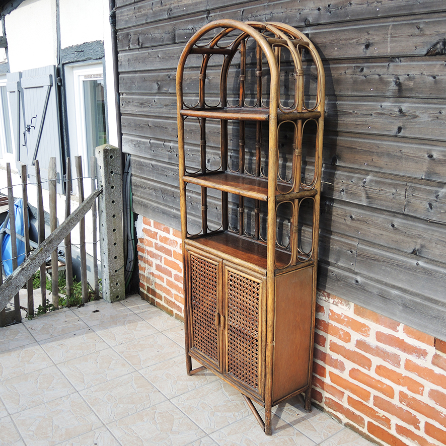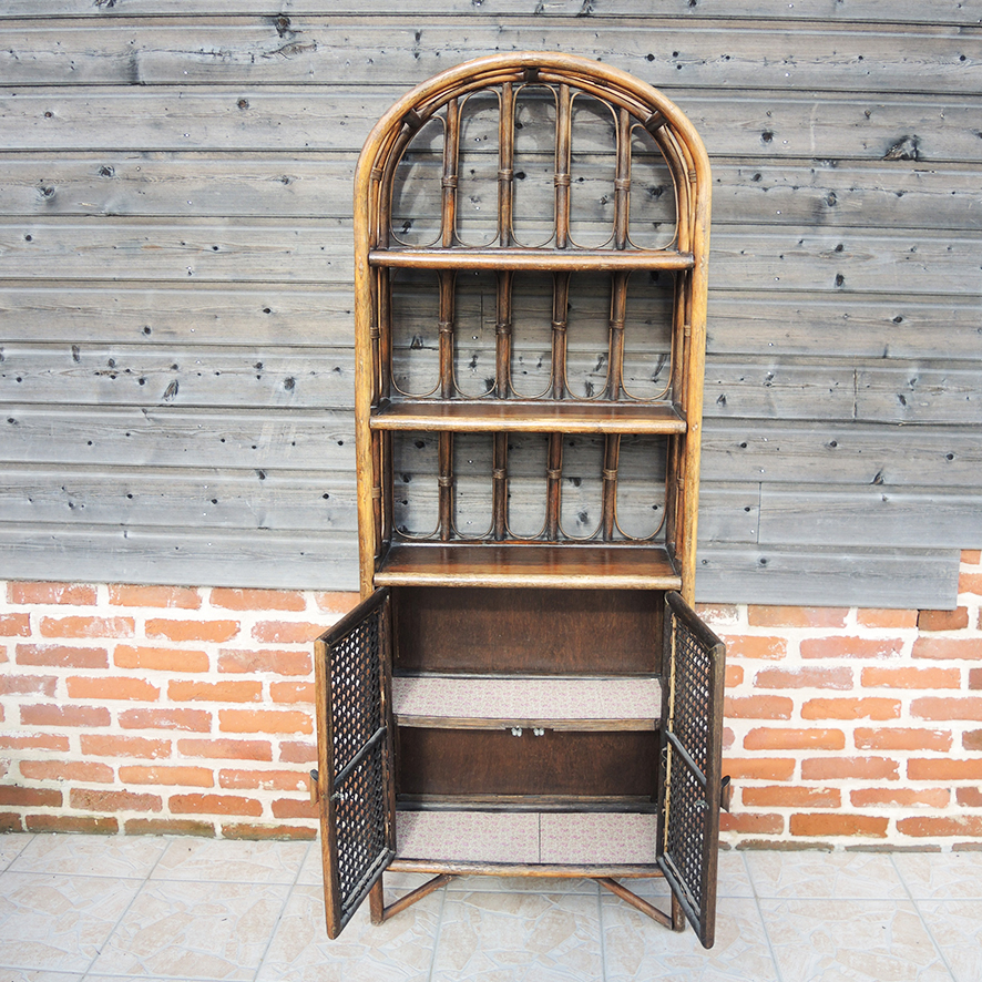 Bibliothèque vintage en rotin de forme arrondie, composée de 3 étagères ainsi qu’un compartiment avec deux étagères tapissées fermé par deux portes cannées.