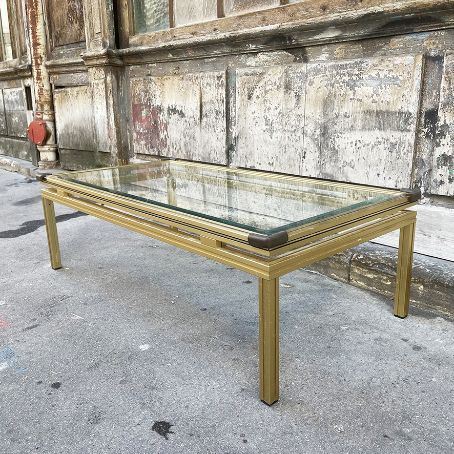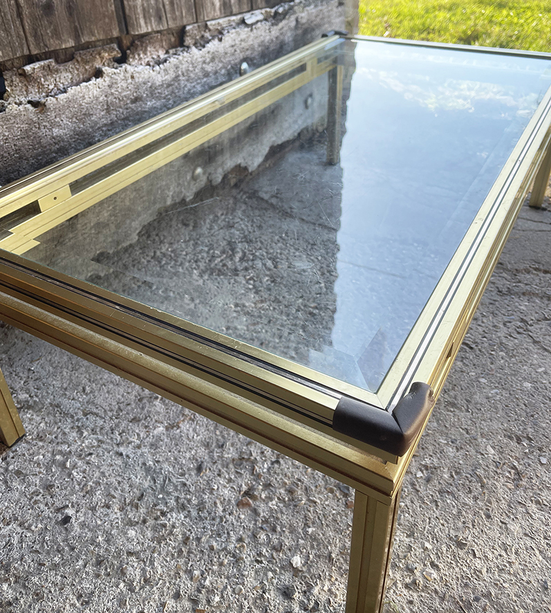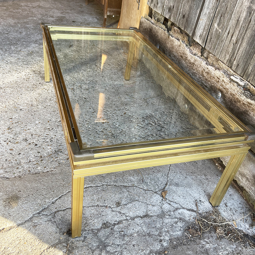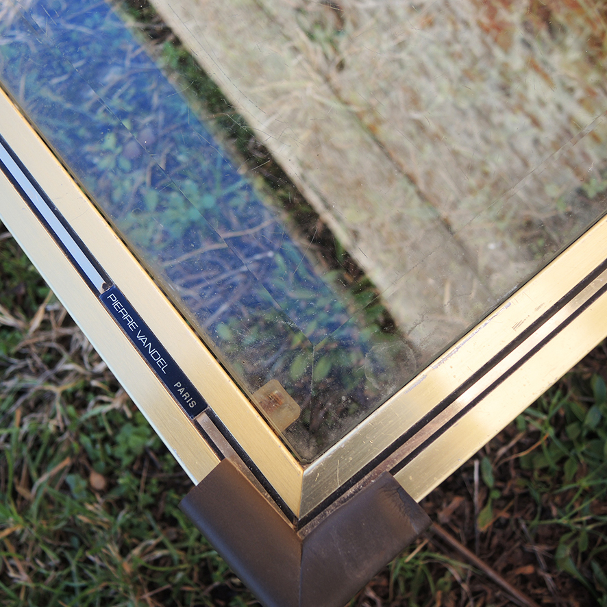 Table basse vintage en verre et laiton signée Pierre Vandel.