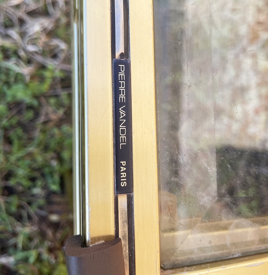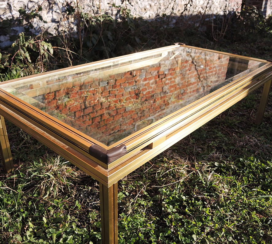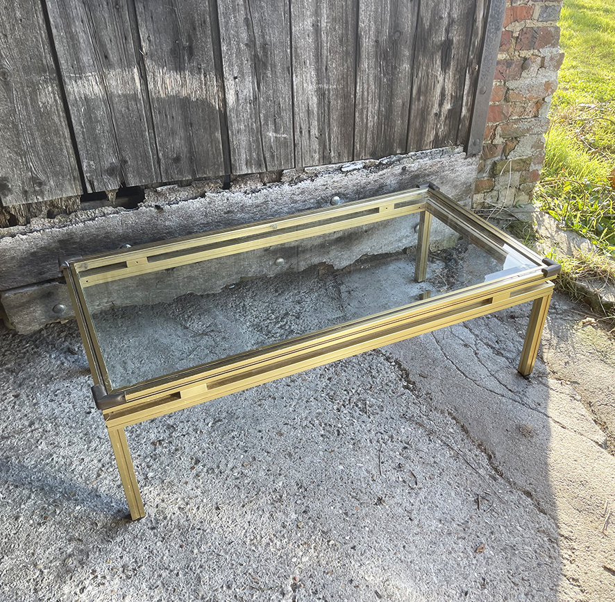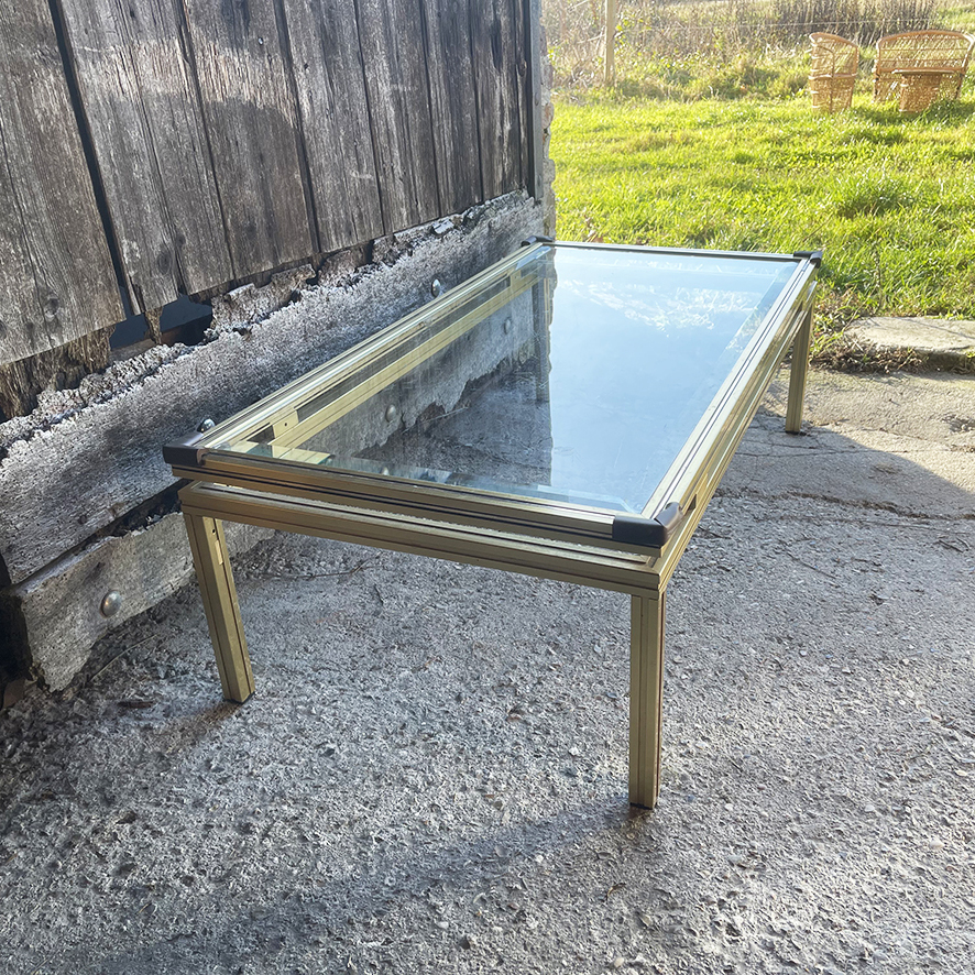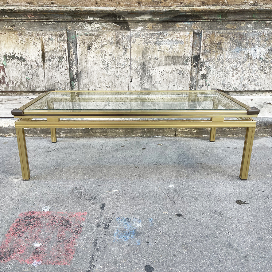 Table basse vintage en verre et laiton signée Pierre Vandel.