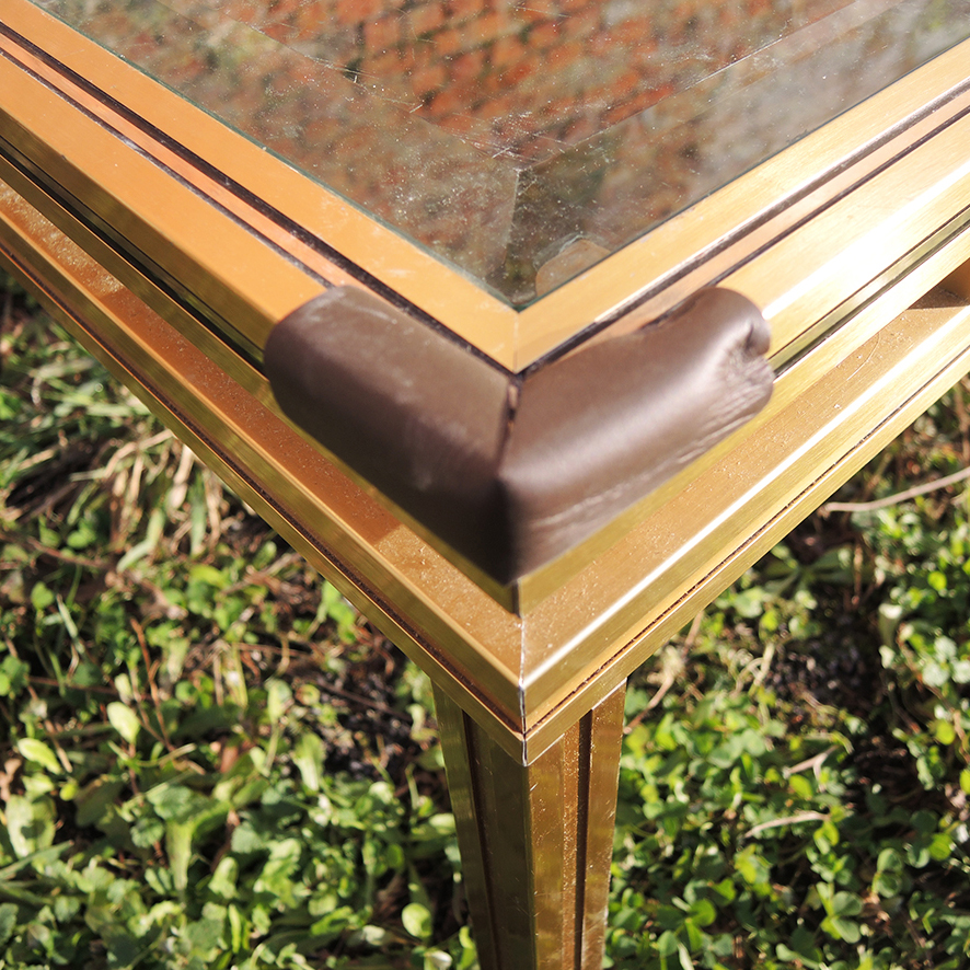 Cette pièce se distingue par l’élégance de sa structure en laiton aux lignes épurées, associée à un plateau en verre qui apporte légèreté et raffinement à l’ensemble. Les coins sont protégés par des embouts en cuir marron.