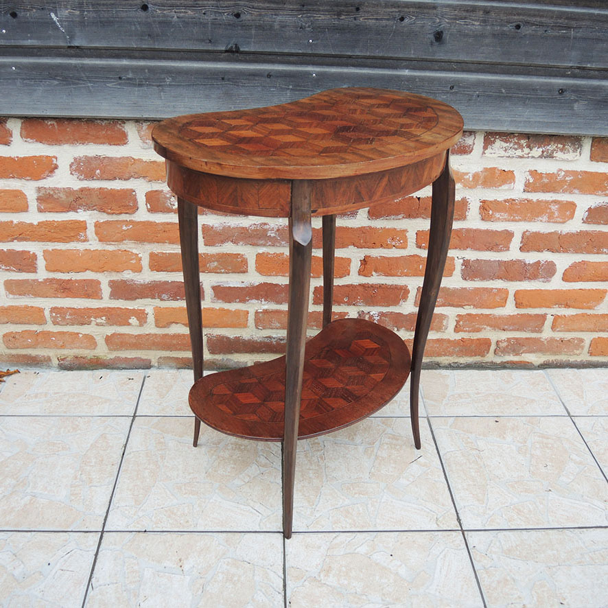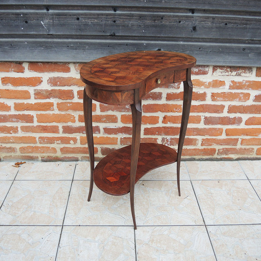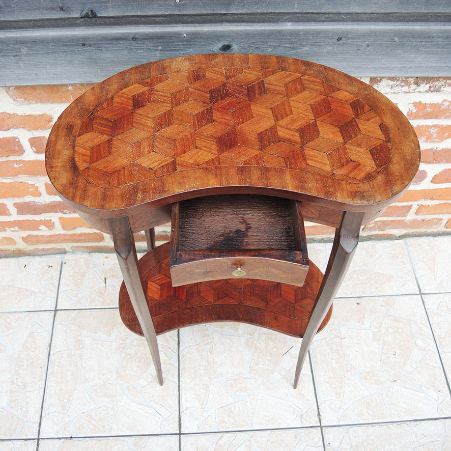 Charmante table d’appoint vintage en forme de rognon,  de style transition louis XV / XVI, dotée de deux plateaux en marqueterie.