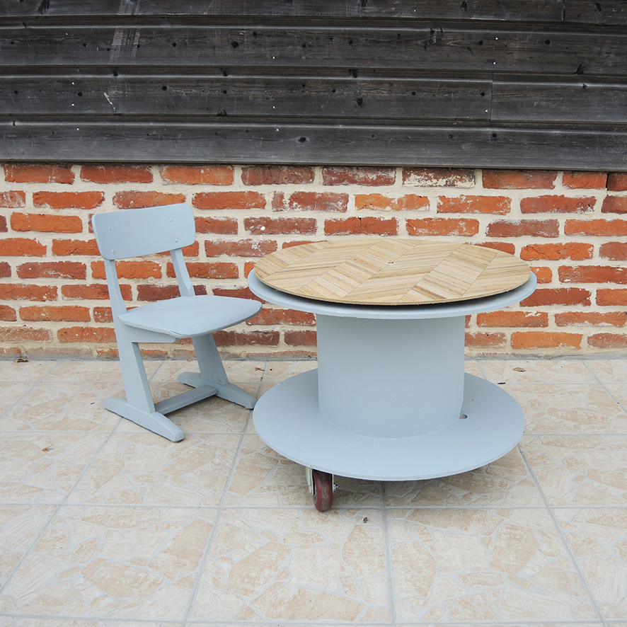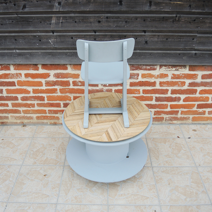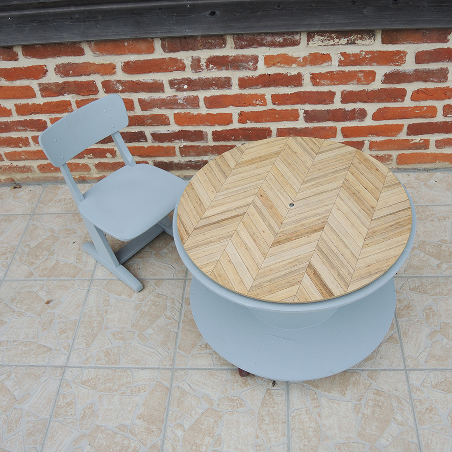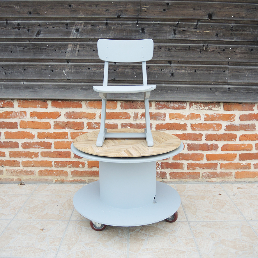 - Une bobine en bois massif poncée et peint en gris, surmonté d’un plateau en bois décor pointe d’Hongrie, et équipée de roulettes.