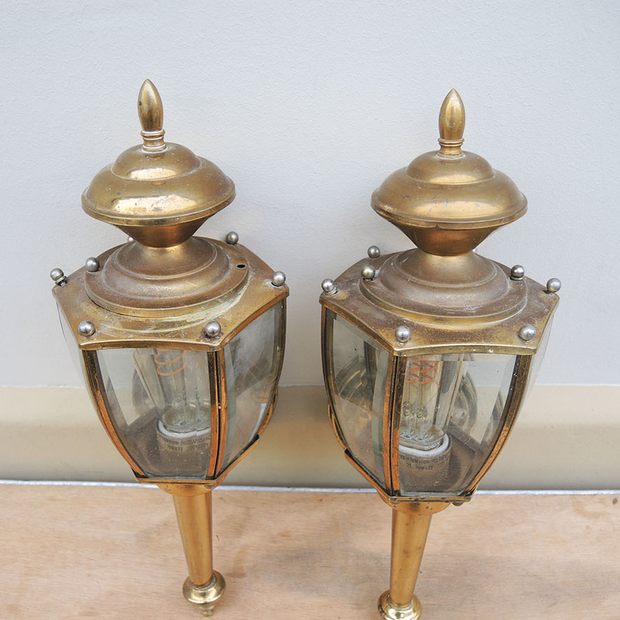 Cette paire de luminaires vintage séduit par son allure authentique et son caractère intemporel, rappelant l’éclairage des voitures hippomobiles du XIXᵉ siècle.