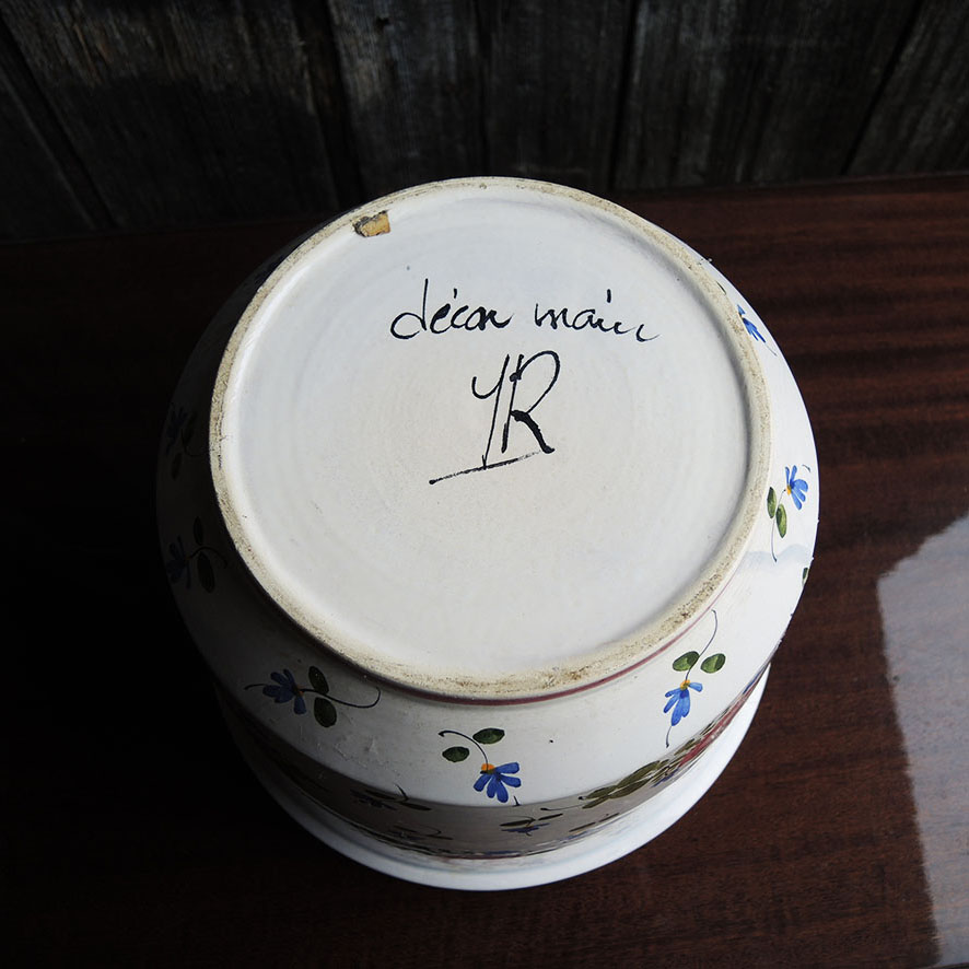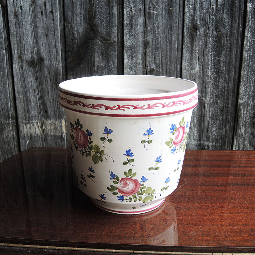 Ancien Cache Pot en Faïence Décor Floral Peint Main