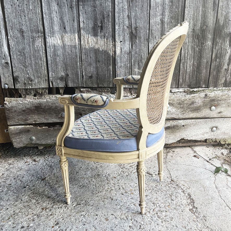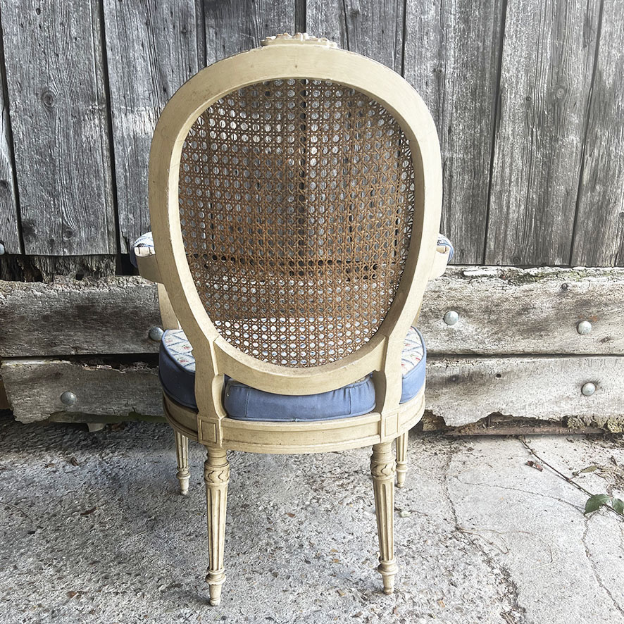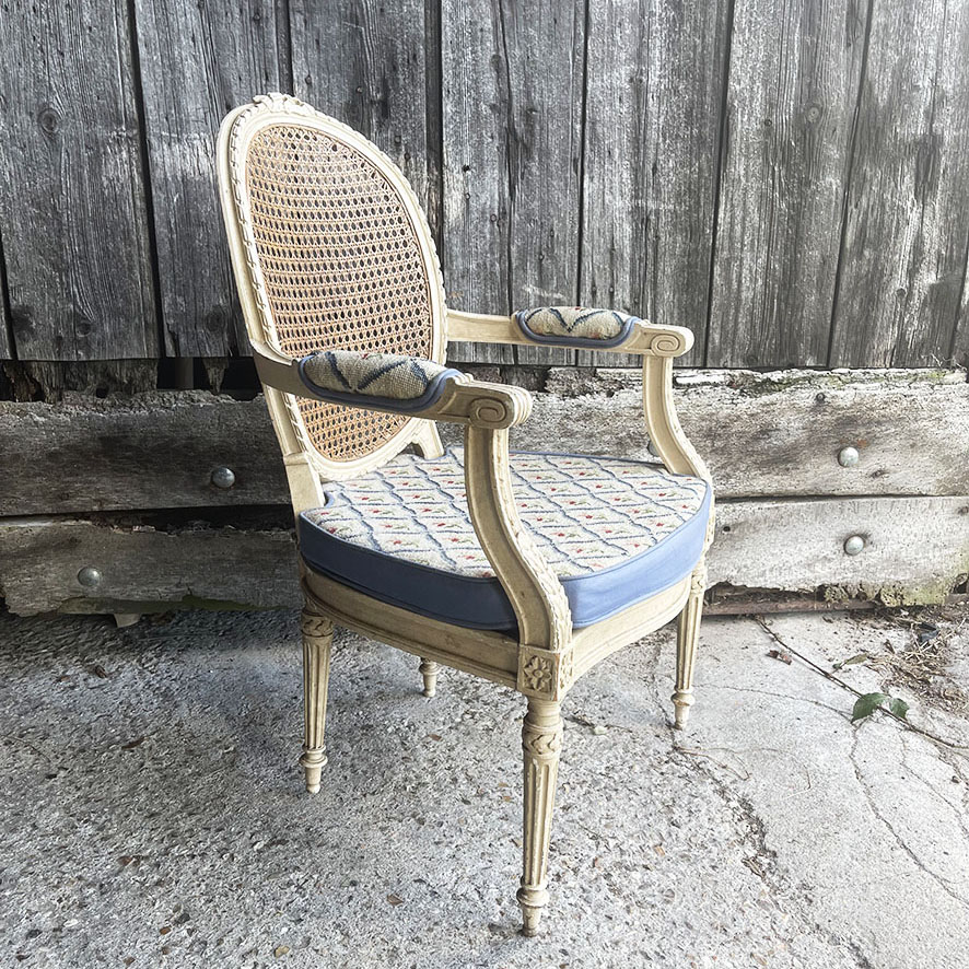 - Une galette et des recouvre accoudoirs en tissu bleu et blanc au motif fleuri