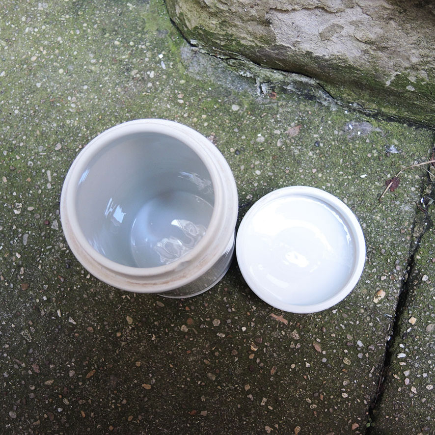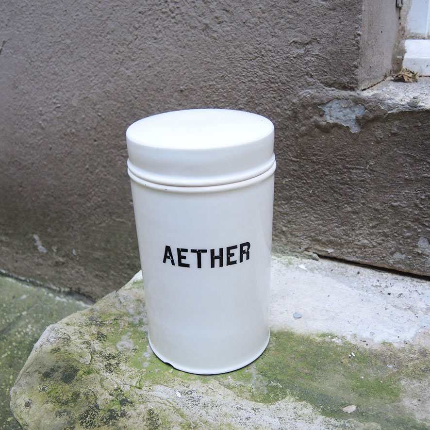 Pot de pharmacie vintage en céramique blanche avec couvercle sur lequel est imprimé en majuscules noires : AETHER.