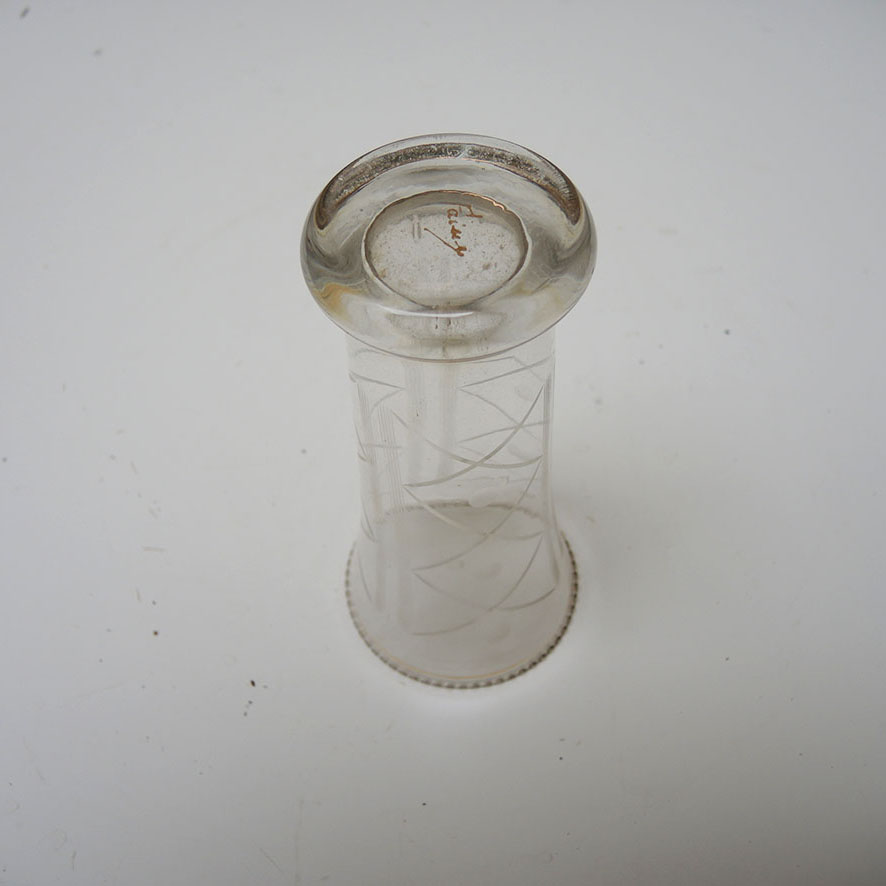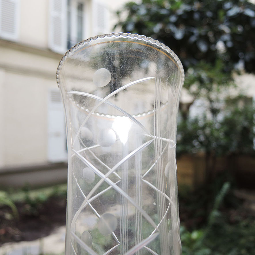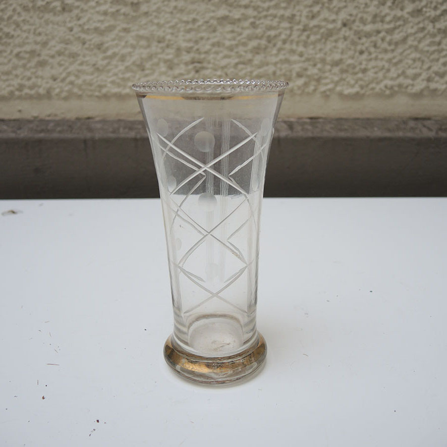Petit vase vintage en verre transparent rehaussé de bandes dorées, qui se distingue par :