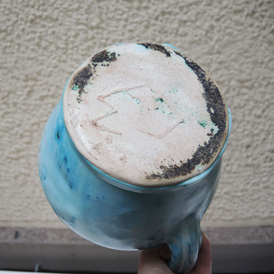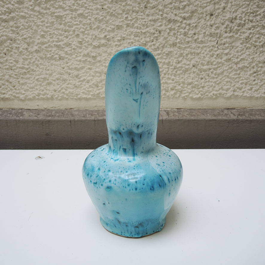 Réalisée en céramique, elle se distingue par sa belle glaçure aux nuances de turquoise et de bleu foncé, typique de la production de Vallauris.